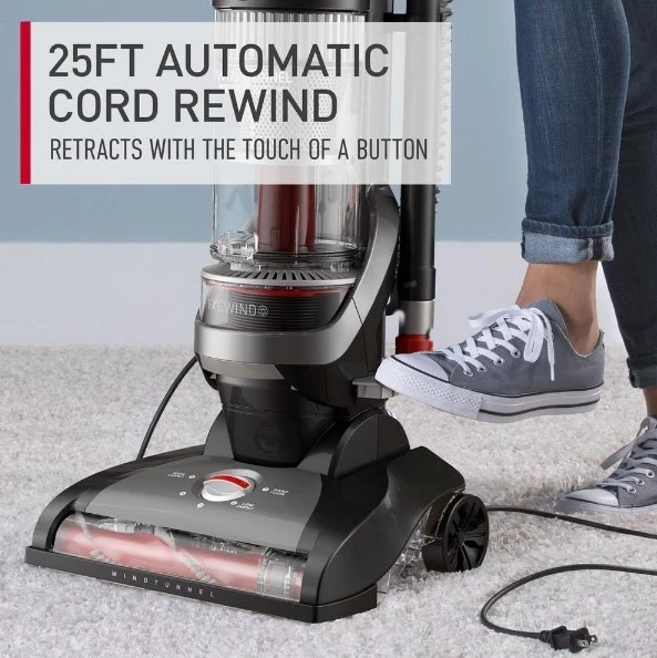 The Hoover® WindTunnel Cord Rewind Pro is ideal for Whole Home Cleaning from floor to ceiling and delivers powerful performance on every surface. WindTunnel technology and Multi-Cyclonic filtration lifts and removes surface debris and deep down embedded dirt with no loss of suction. The 25ft. power cord automatically retracts in seconds so you never have to wrap a cord again. An assortment of tools and an extra-long cleaning hose offers up to 10ft. of above floor reach to easily clean blinds, bookshelves and more.. For over 100 years, Hoover has re-imagined the way we clean, delivering a complete collection of trusted, innovative and effective solutions designed to make cleaning easier for active families so they can get back to what matters most.
