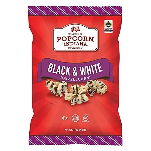 Treat yourself to a delicious snack every time you reach for this Popcorn, Indiana Drizzled Black and White Kettlecorn. It’s great to share with friends, or you can keep it all to yourself. The gluten-free popcorn is sure to be a hit at all of your events and gatherings.