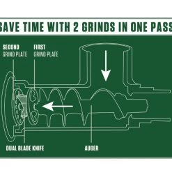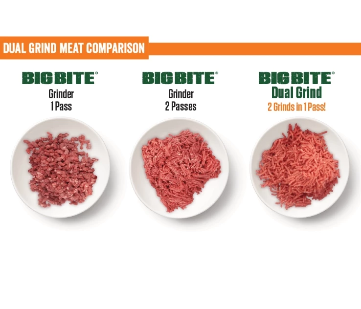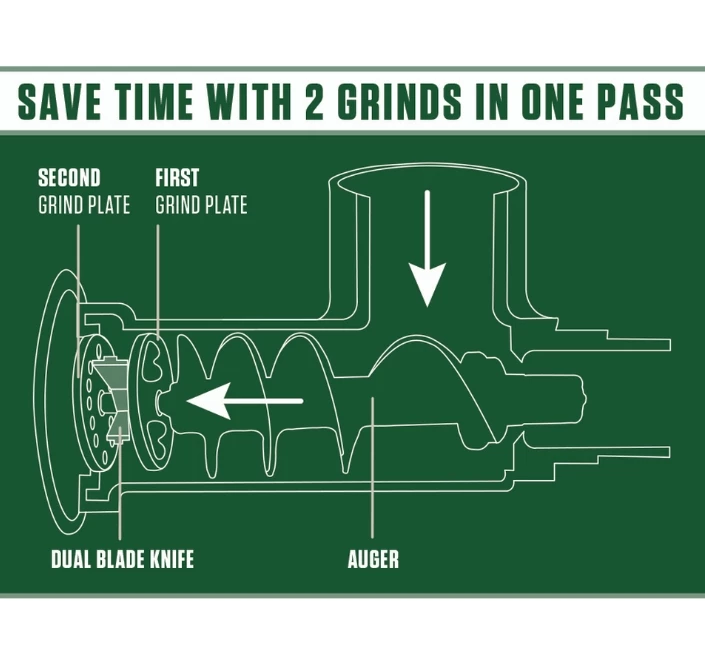 Save time with two grinds in one pass! The New Dual Grind Meat Grinder can cycle through two grinds in a single pass. No more reloading for a second grind. This innovative technology has been used in commercial processing for years, and now we are bringing it to the home processing world! The secret is in the innovative design incorporating a unique double-edged knife and two grinder plates. The result is the quality and consistency of two separate grinds in just one pass. Combined with the Big Bite technology that allows the auger to take an extra big bite of meat and then move it through the grinder quicker than other grinders, you will get a premium grind in half the time!