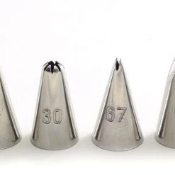 Stainless steel, corrosion resistant, reusable, non-stick, tasteless tips include: #2 Writing Tip, #27 Star Tip, #30 Large Star Tip, #61 Petal Tip, #67 Leaf Tip, and #98 Shell Tip.