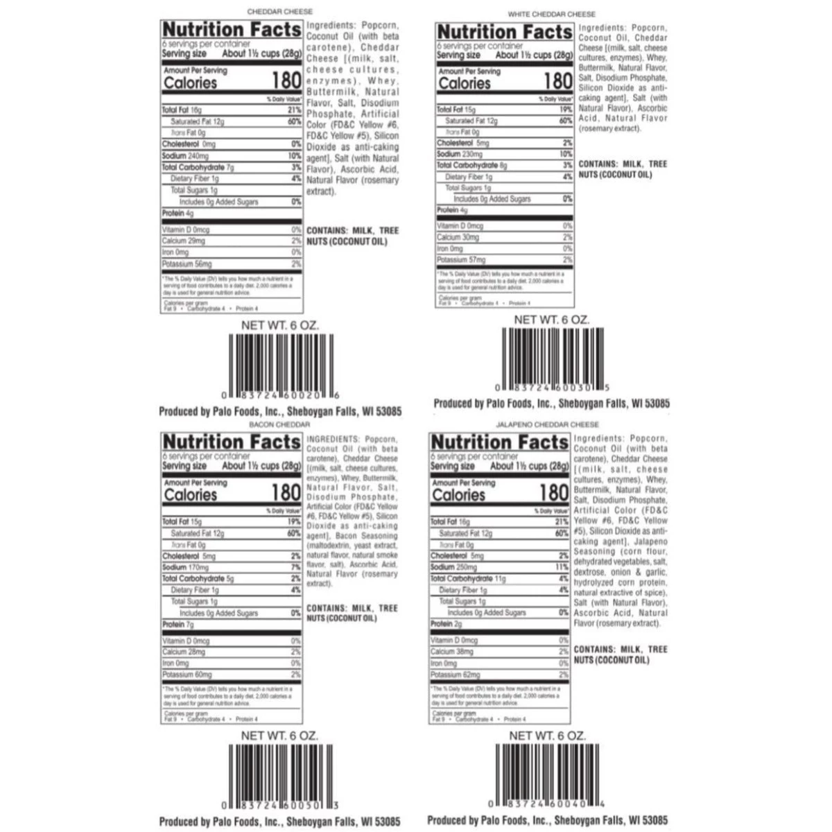 Bacon Cheddar Our Bacon Cheddar, the latest addition to the Palo Popcorn lineup, has become one of our most popular sellers and most talked about flavors. Pure coconut oil, non-GMO seed, salt, REAL cheddar cheese, and our unique bacon seasoning. Mmm…Bacon. |